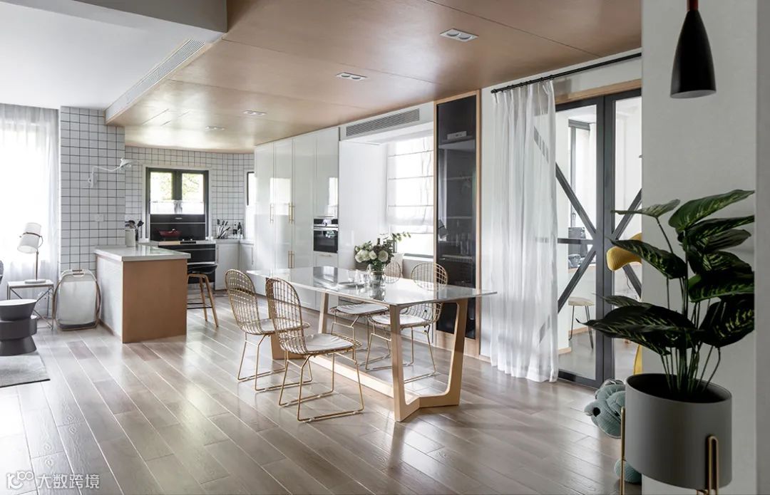 餐厅厨房采取的是开放式的空间设计,布置餐桌与中岛台,天花木色的吊顶+无主灯设计,显得显得充满文艺与精致的气息。