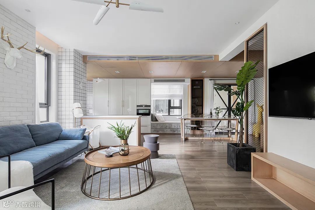 在客厅与厨房之间,加入中岛台,这样可以挡住厨房的杂乱,保持客厅区域的美观。