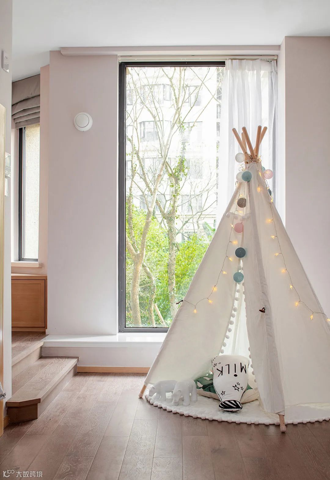儿童房采取上下床的设计,布置小帐篷,墙面也加入软木板的设计,软木板上挂满小照片,让空间显得童趣舒适而活泼。
