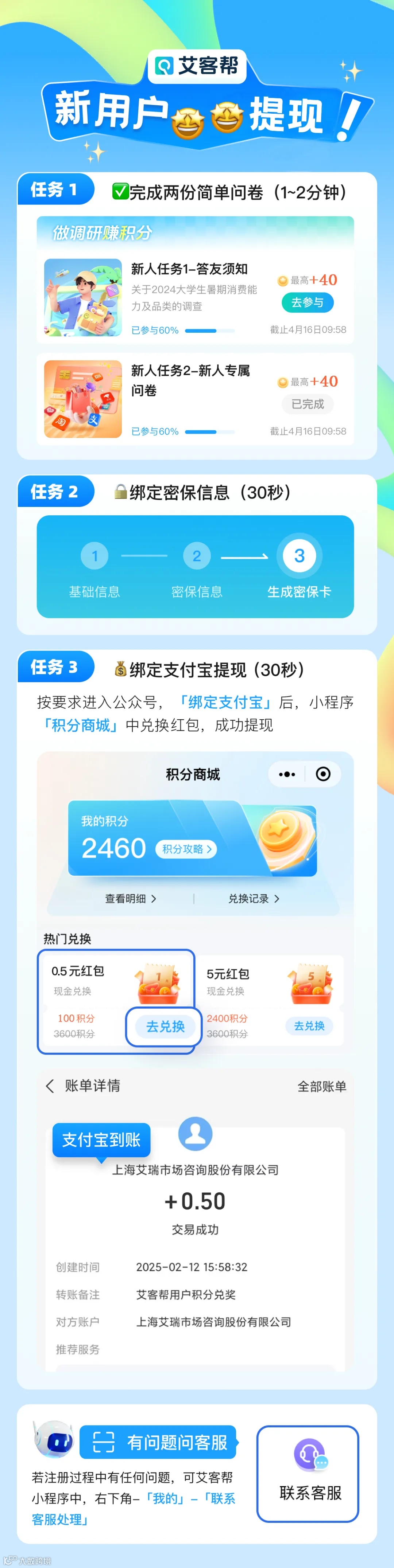 感谢您关注艾客帮!如有疑问,请通过小程序【我的】-【联系客服】联系。祝您和朋友们满载而归!