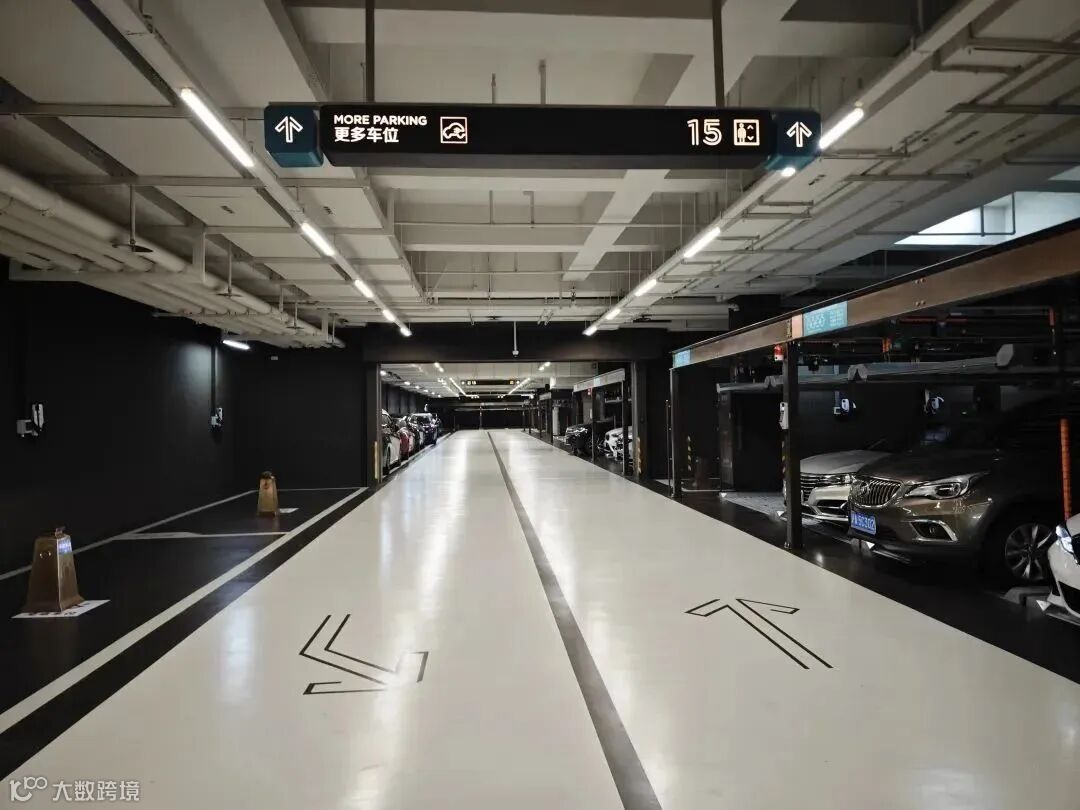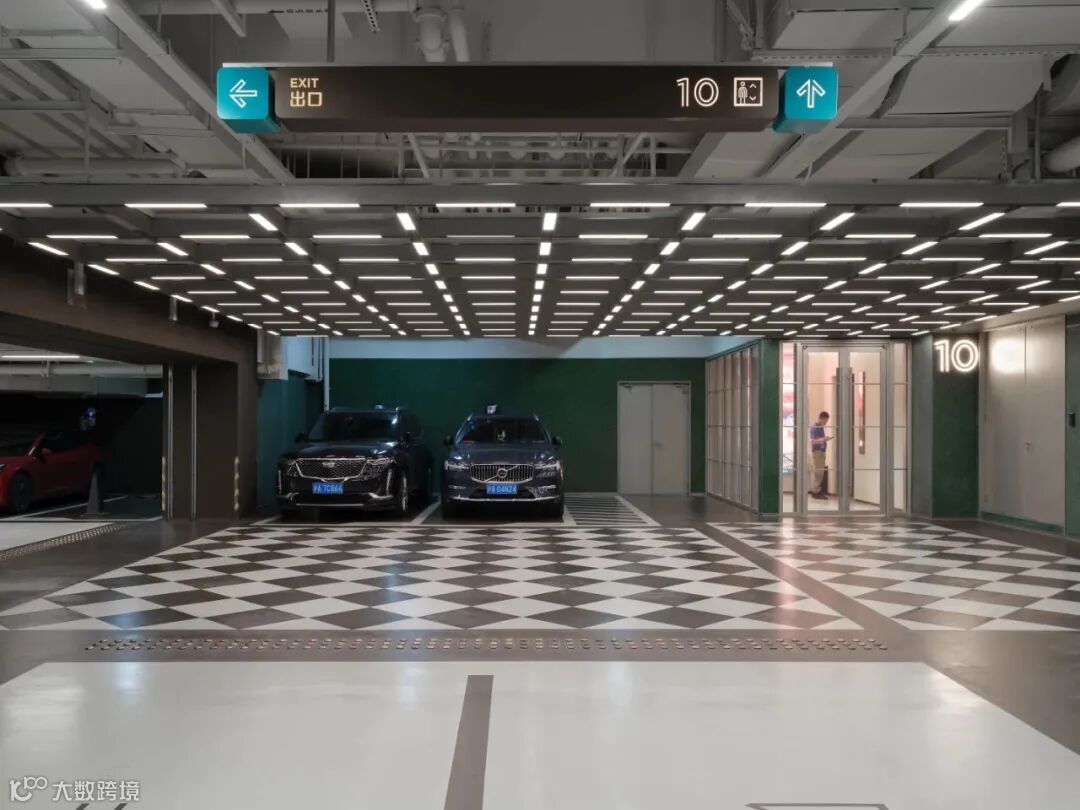 在停车场设计上,朗迈的巧思远不止于此。地库延续了建筑灰空间的特色元素 —— 华夫格灯具,而朗迈打造的棋盘格环氧树脂地面与之相互呼应,形成了视觉上的和谐统一。灯光透过华夫格的纹理洒在地面,光影交错间,让整个地下停车场更具艺术氛围,仿佛一处地下艺术展厅。