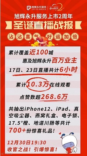 旭辉永升服务开通视频号总共10天时间,2次直播,关注数量突破42000人,覆盖80余城上百万业主,首次直播参与人数6.3万人,累积10.3万在线观看,点赞数超268.6万。送出Iphone12、燕窝礼盒等,价值10万余元,330多份惊喜礼品。我们采访了喜业享数创始人尹东宏先生,他说这是我们在全国直播经济总部基地响应国家对在线经济、上海市政府打造上海成为品质直播第一城和青浦区领导的指示精神办的青浦注册的上市公司的品质直播活动,接下来我们也还有更多品质直播活动陆续推出。同时,我们也期待在上海享数数据科技有限公司的统筹规划下,12月30日19:30旭辉永升的又一场视频号直播!