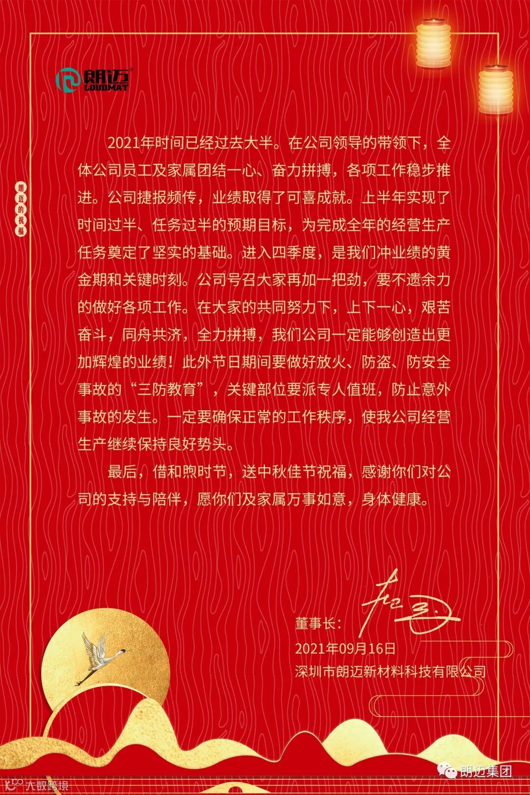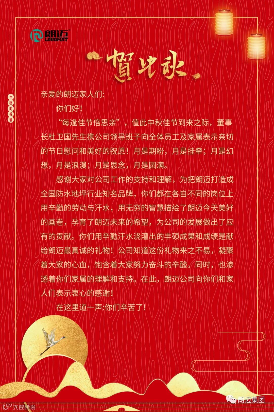 皎皎天上月,圆圆中秋节。脉脉星河稀,款款逢佳期。朗迈公司董事长杜卫国先生及公司领导也为朗迈全体员工及家属表示亲切的节日慰问和美好的祝愿!