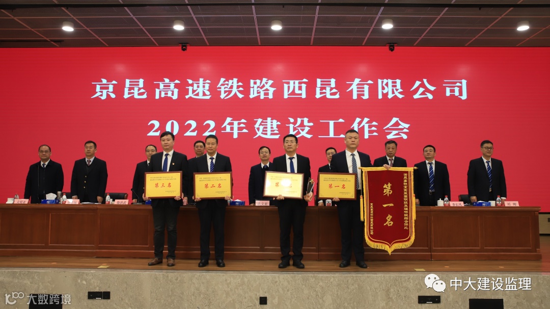 2022年1月16日京昆高铁西昆公司召开年度建设工作会,会议对2021年综合考评优胜单位监理单位和先开段劳动竞赛中涌现的先进个人进行了表彰,并为获奖单位及个人颁发了相关奖牌、流动红旗和奖杯。其中我公司负责承担的渝昆高铁云贵段监理一标项目部在渝昆高铁宜宾至嵩明段新进场共7家监理单位中综合排名第一名,被授予“综合评比第一名流动红旗”、当期“综合评比第一名”奖牌。总监雷宁宇被表彰和授予“先进个人”的荣誉称号,并获得奖金奖励。