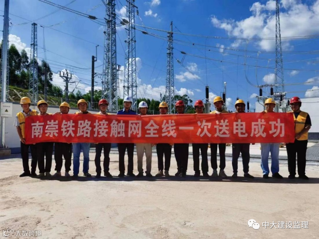 2022年8月9日,由长沙中大建设监理有限公司监理的新建南宁至崇左铁路骆越(崇左南)、碧计(渠黎)、平桩3座牵引变电所供电臂终端验电检测顺利完成,南崇铁路全线接触网一次送电成功,全线供电线路、接触网及相关设备均完全带电。南崇铁路全线“电通”,标志着南崇铁路电气化建设完成,为即将开展的联调联试提供先决条件和动力保障。
