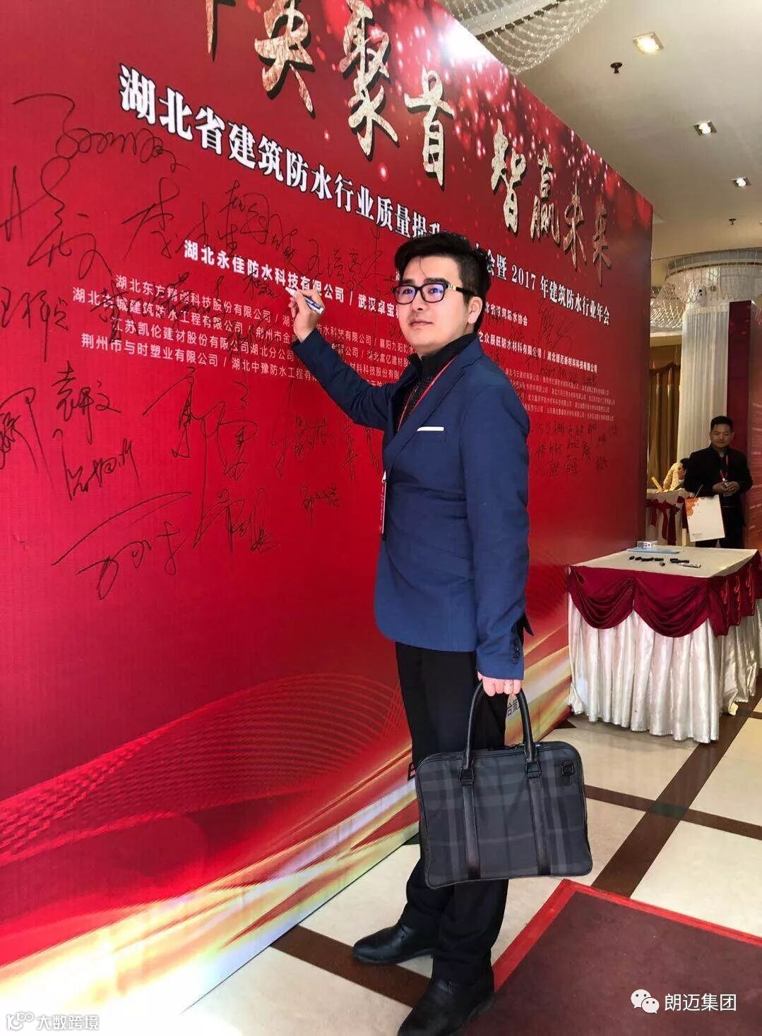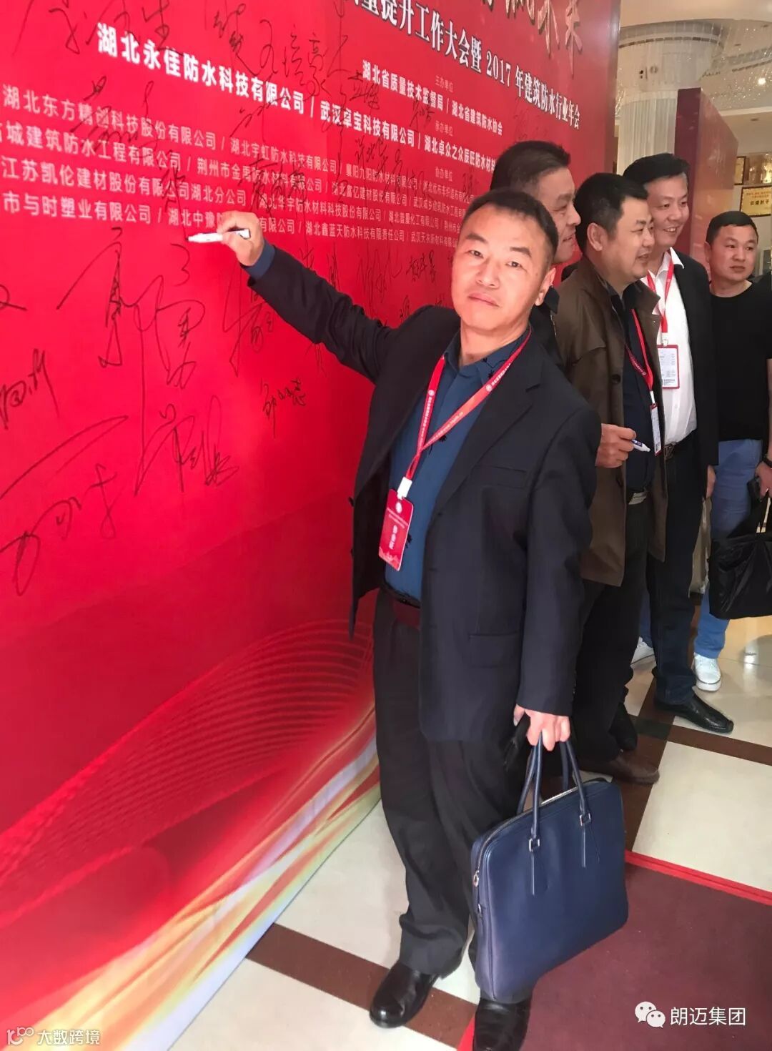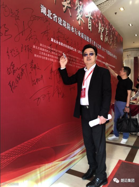 朗迈公司董事长杜卫国、总经理戴正辉、副总经理杜磊、湖北分公司总经理郑明宏应邀参加此次会议,与各位同仁共襄盛会。四位领导在签到板上郑重写下自己的名字,书写朗迈成为中国防水防腐系统解决商与领先者的壮志豪情。