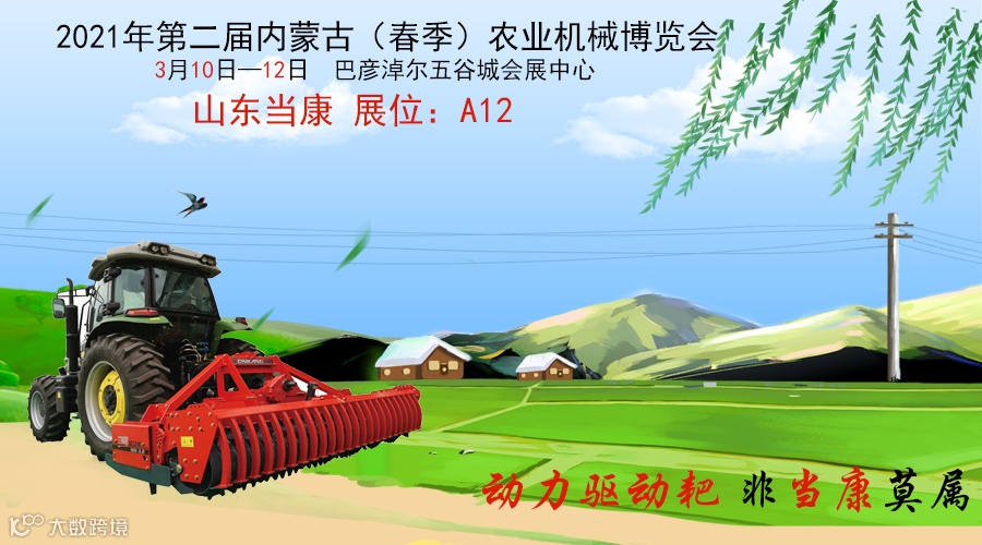 新春3月,万物复苏,又到了农机人开始忙活的季节。山东当康农业装备有限公司诚邀您于3月10日至12日参加在巴彦淖尔五谷城会展中心召开的2021内蒙古春季农机展,届时山东当康携多款新型动力驱动耙产品亮相本次展会。