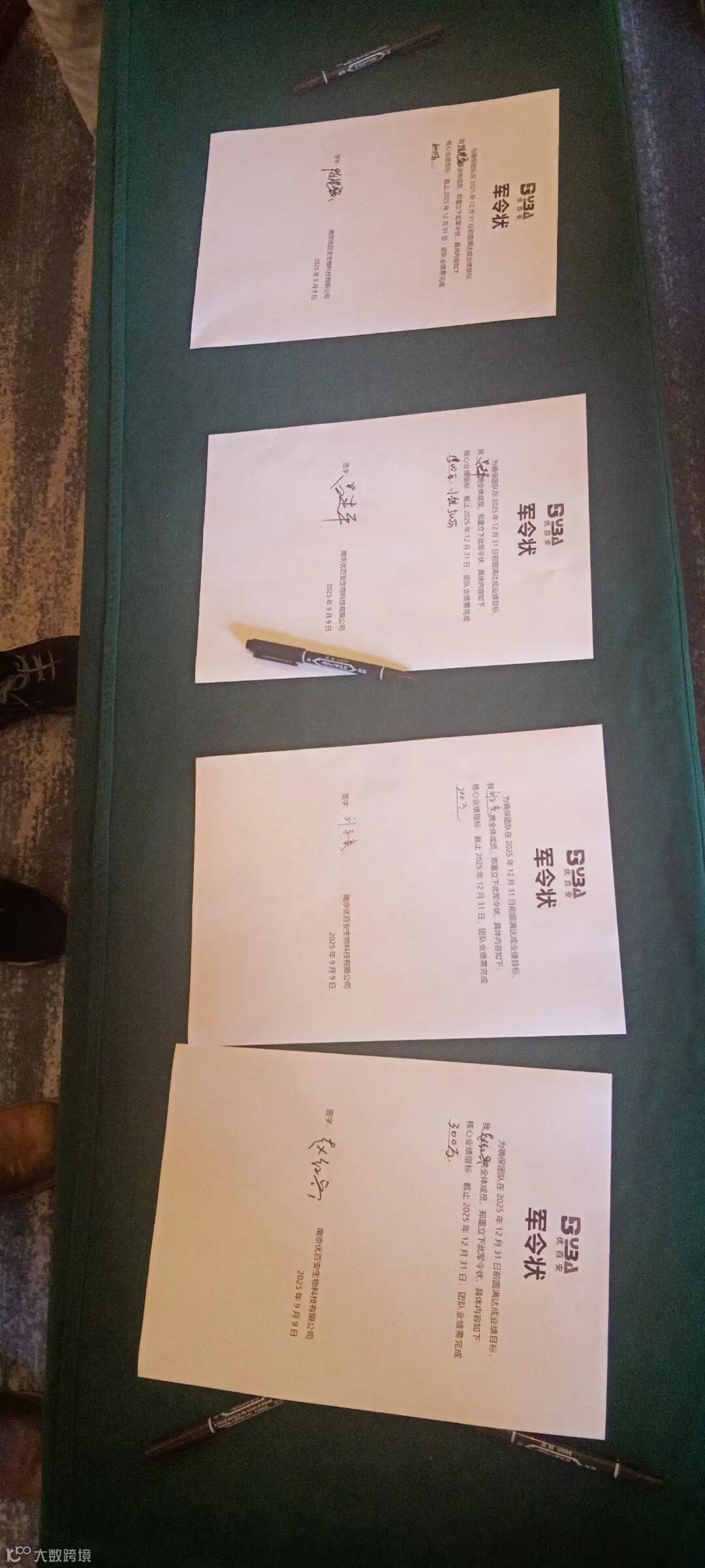 思想交流过后,一场 “百日大战” 军令状签署仪式点燃全场热情。从 V4 到 V3、V2 的经销商,再到各地区领导人,纷纷提笔签署军令状,明确以 12 月 31 日为节点的业绩目标:有的伙伴定下 “百日开拓 4个V4” 的目标,有的计划 “带领团队完成1500万销售额”。每一份军令状上的数字,都是优百安人对沙棘事业的决心;每一次落笔,都是对未来的郑重承诺。“从今天到 12 月 31 日,我们一起冲刺目标,不辜负自己,不辜负团队!” 一位地区领导人的发言,道出了所有人的心声。