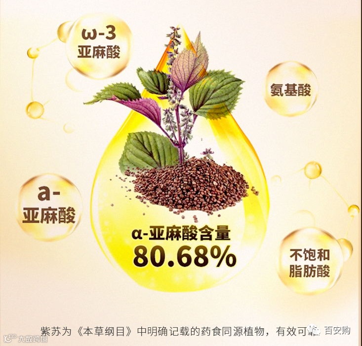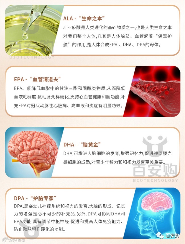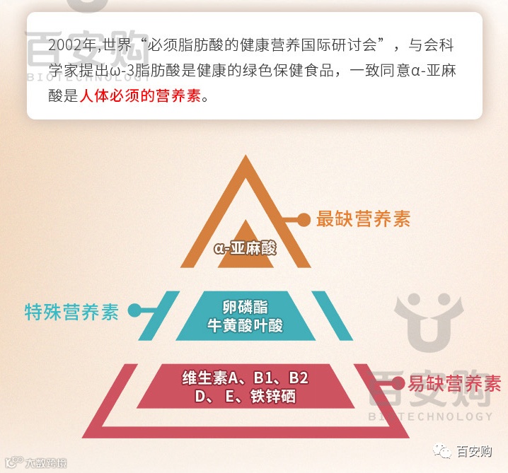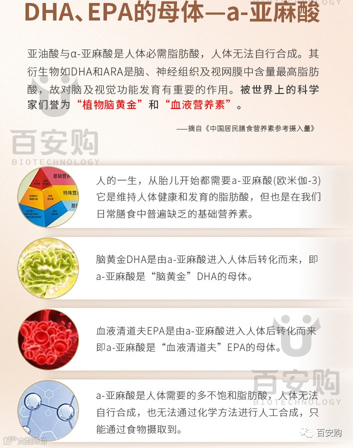 科学家认为α-亚麻酸是人体必须的营养元素,也是中国人普遍缺乏的营养素,人体无法合成的必须的脂肪酸,只能通过食物摄取,无法化学合成。α-亚麻酸也是合成EPA、DHA、DPA的母体,EPA被誉为“血液清道夫”,DHA被誉为“脑黄金”、DPA被誉为“护脑专家”。