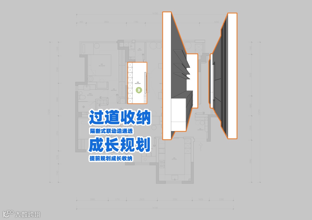 解析3▶过道区域进行功能分割,与过道形成隔断式联动,巧妙划分出一处独立又通透的空间。在此打造一整排定制收纳柜体,兼具实用性与设计感,让原本单调的过道变身多功能储物区。充分考虑未来二胎家庭的生活需求,专门预留出儿童玩具、绘本等物品的专属收纳空间,分类清晰、拿取方便。既优化了动线与格局,又提前为孩子成长做好规划,让居家环境整洁有序、温馨又有秩序感。