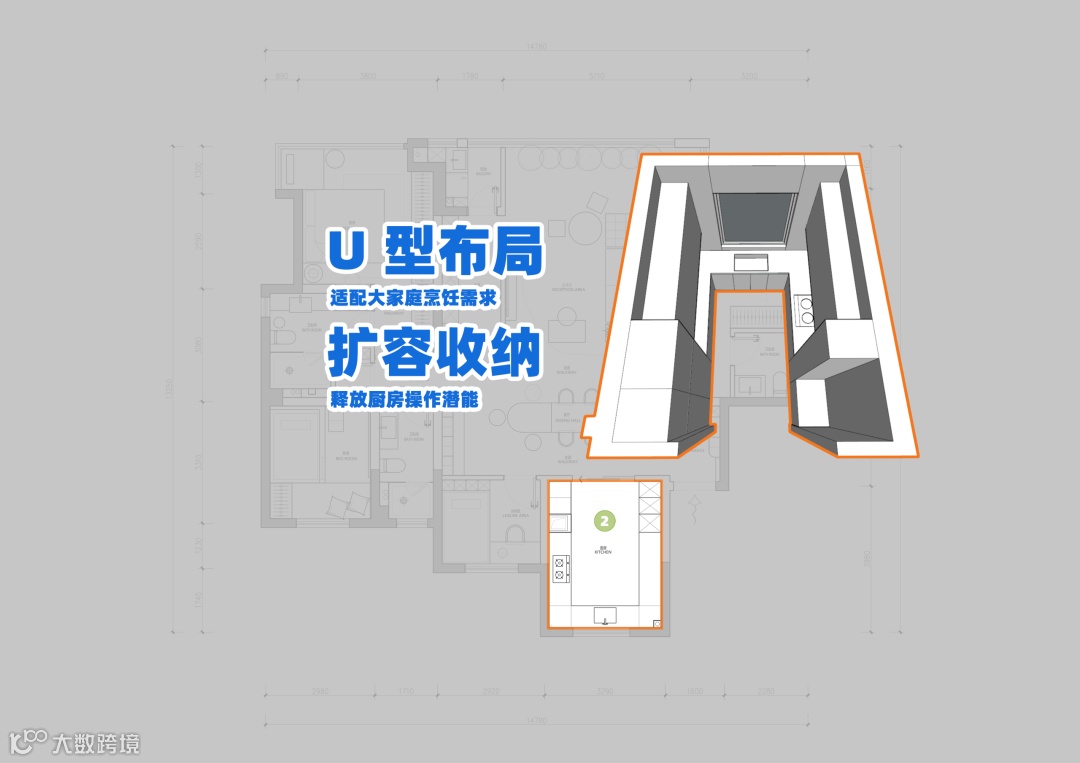 解析2▶厨房向外拓展,大幅增加收纳、储物空间与操作台面,打造更从容的烹饪环境。考虑到家庭人口多、未来有二胎计划,且有老人同住,日常下厨频率高,特意将厨房布局优化为U 型布局,操作流畅、转身即取,使用效率更高。同时预留充足位置,将各类家电与柜体自然融入,整体整洁统一,既满足大家庭长期使用需求,又兼具实用与设计感。