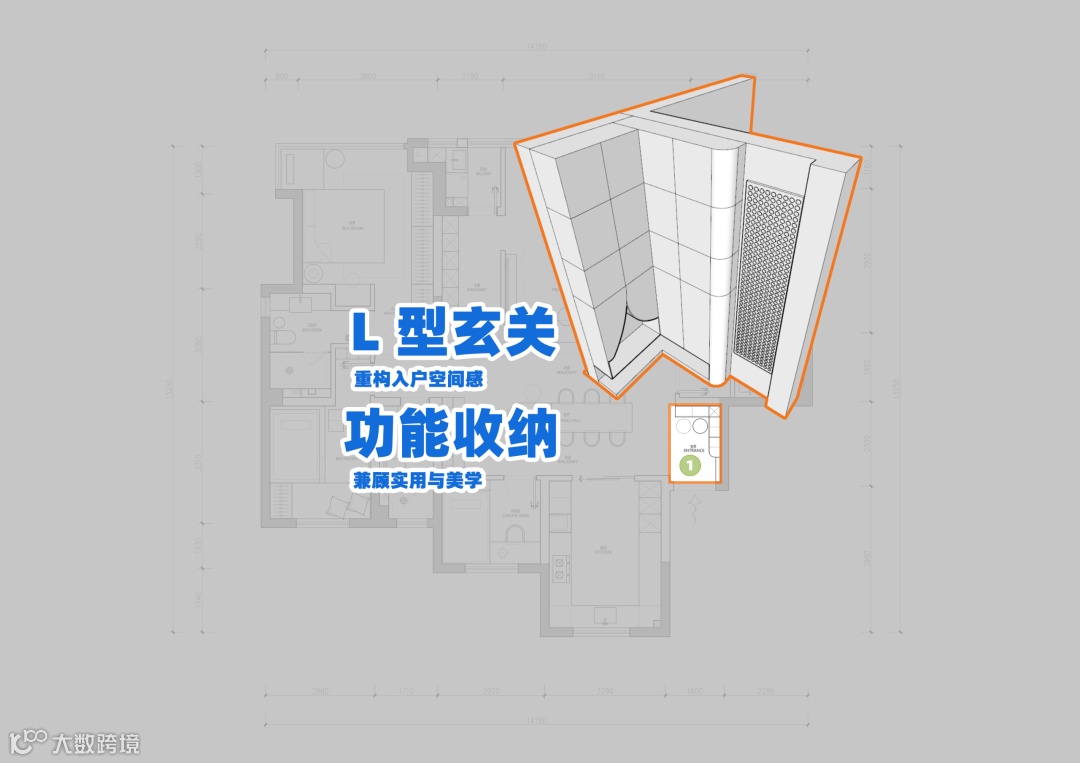 解析1▶玄关进门左手侧墙体拆除,打造通透开阔的 L 型玄关格局,整体更显利落大气。搭配斜凳设计,兼顾实用与美感,归家瞬间便有舒适从容的体验。L 型鞋柜作为核心收纳,分区清晰,满足一家人日常鞋物有序归置,专门区分干净鞋与外出鞋,既卫生又整洁。动线流畅、收纳合理、颜值在线,让入户第一空间兼具设计感与生活温度。