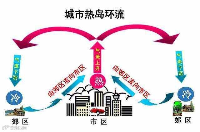在热岛效应的作用下,城市中每个地方的温度并不一样,而是呈现出一个个闭合的高温中心。在这些高温区内,空气密度小,气压低,容易产生气旋式上升气流,使得周围各种废气和化学有害气体不断对高温区进行补充。