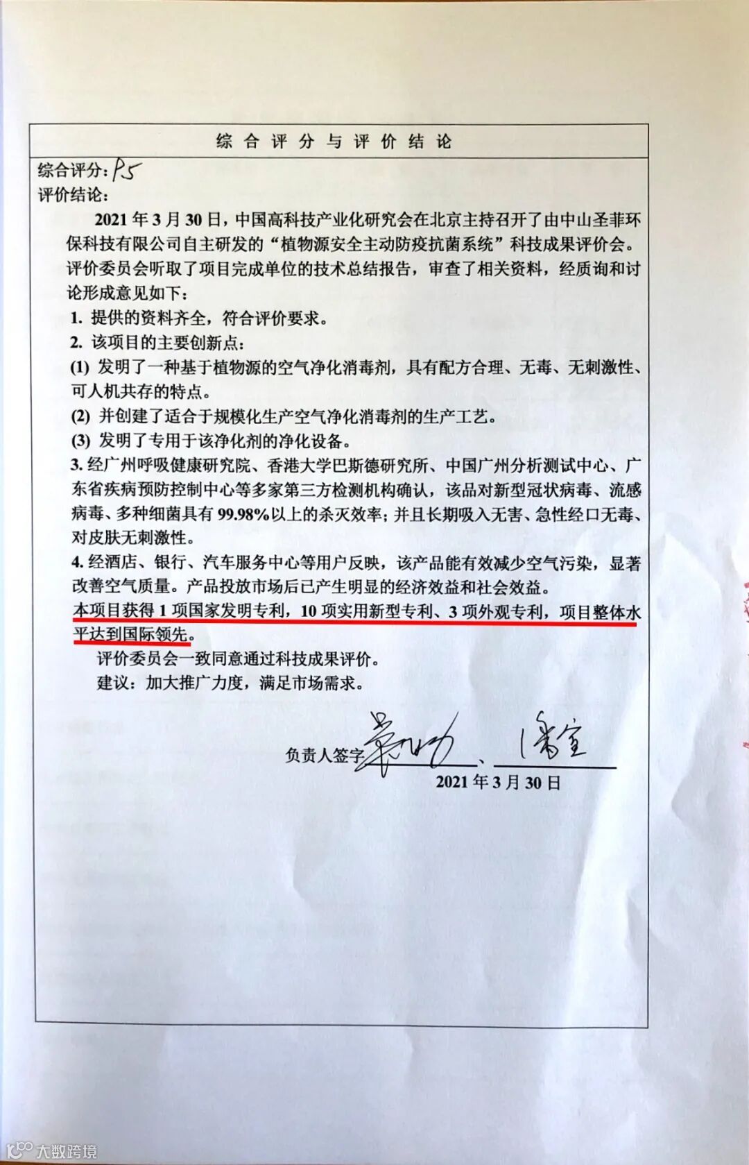综合评价结论:“达到国际领先”