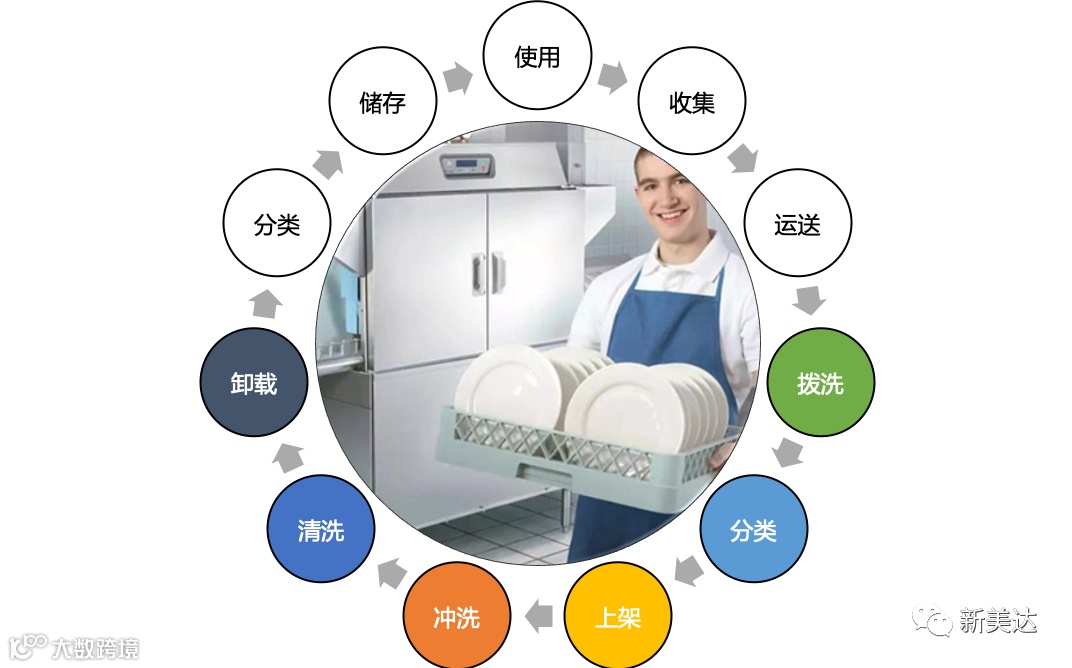 顾客使用餐具之后,经过前场服务人员的收集、运送至后场洗碗间,经过拨洗、分类、装筐上架、花洒预冲洗、过机清洗、卸载、分类储存后再次被顾客使用。其中至少有6个步骤是在洗碗间中完成并与洗碗机洗涤有关的。