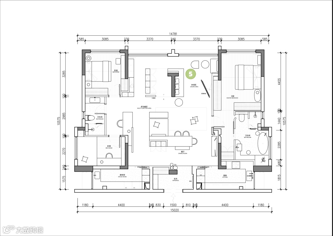 解析2▶多元组合式餐岛一体化设计,打破传统边界,营造多元交流与互动场景。模块化单人沙发灵活组合,随需落座;定制吧台柜体通顶设计,清晰划分过道边界,引导动线分流。中央区域特别规划儿童表演小舞台,延展空间活动范围,让家成为亲子共乐的活力场域。