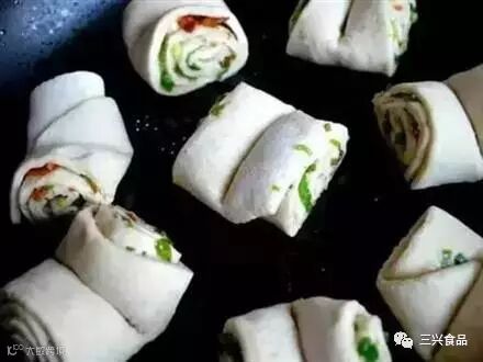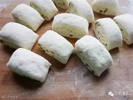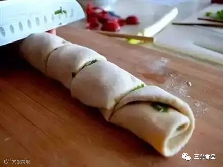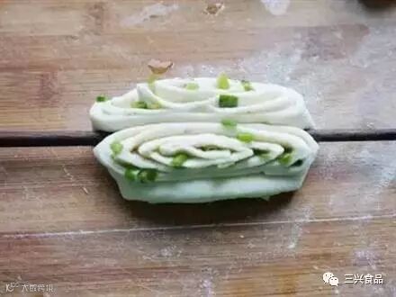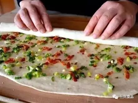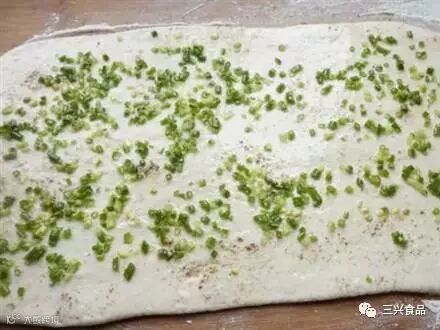 油,盐,葱花拌好后放在面团上,如果有十三香什么的,也可以加点。如果喜欢吃肉,就撒上肉碎去再卷。