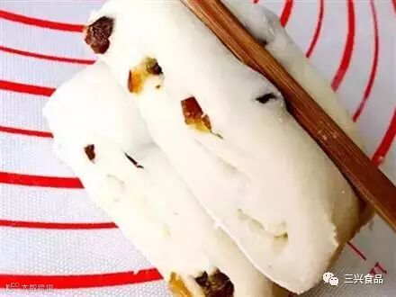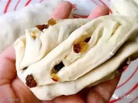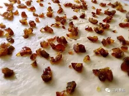 3、面团发酵至2倍大小后,取出面团,继续揉,揉至不粘手、光滑面团后,擀成面片,撒入切好的蜜枣丁,从下往上卷起来。