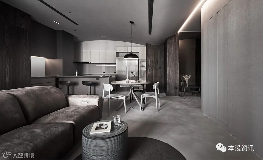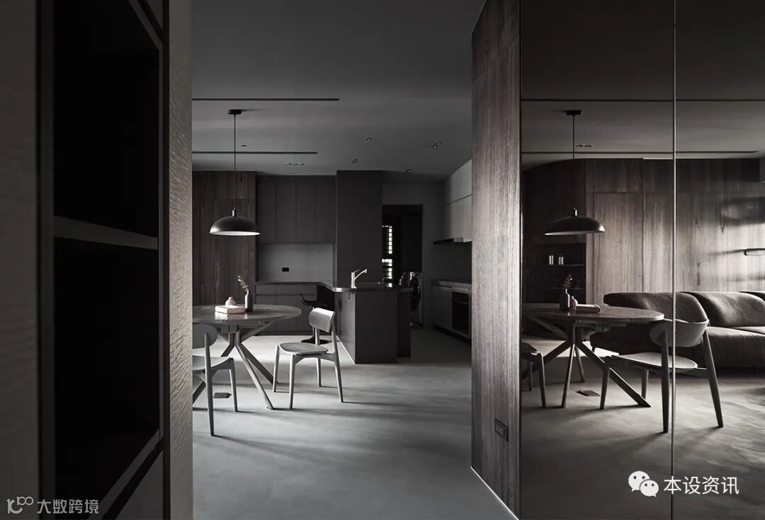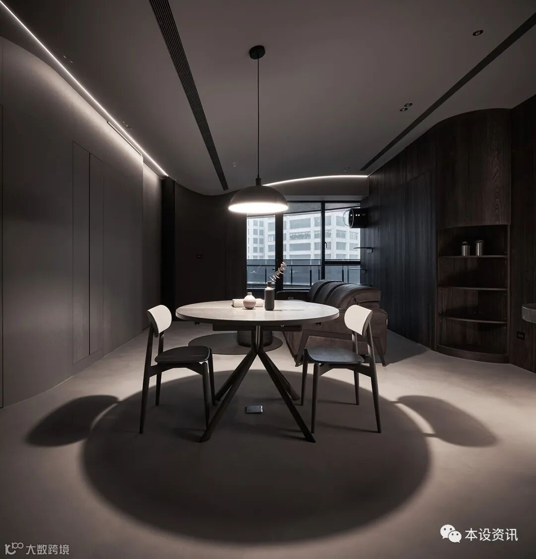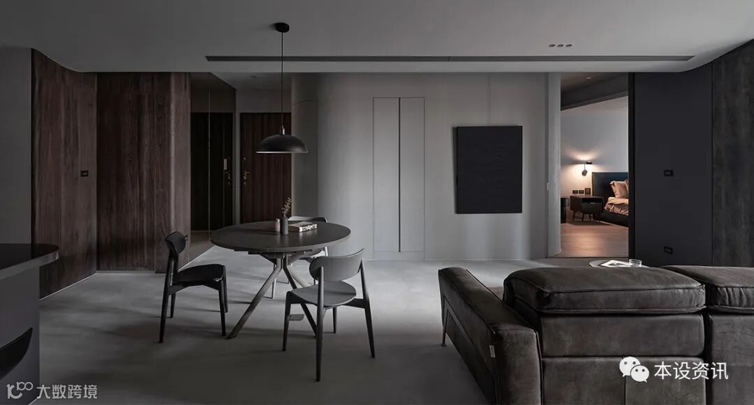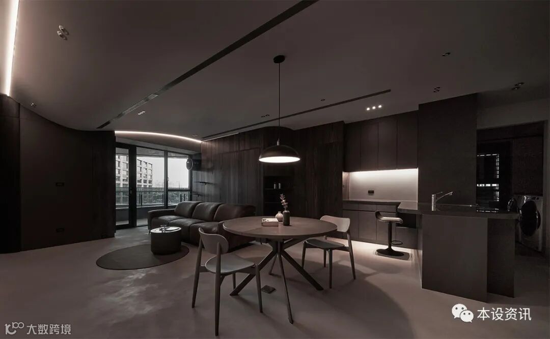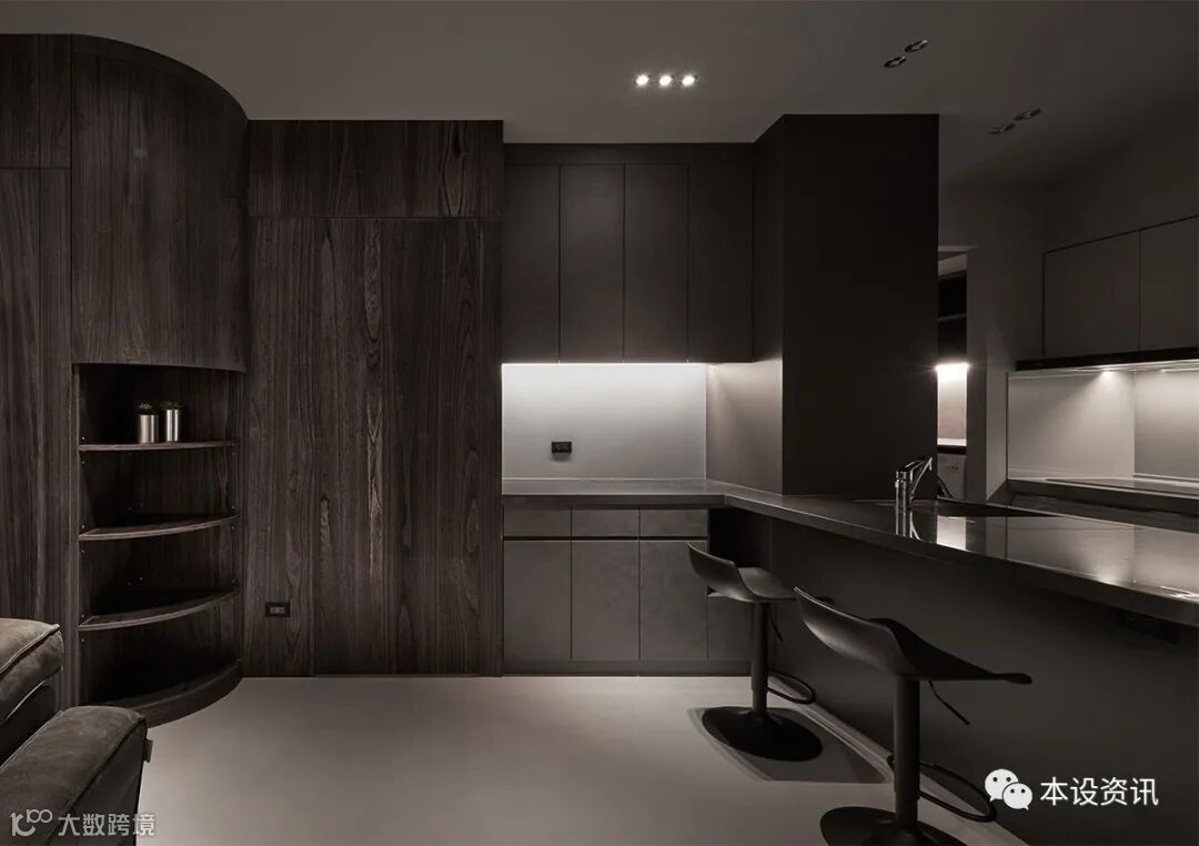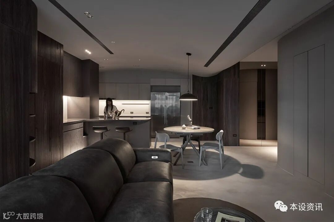 以夫妻俩倾心的深色调当作主轴,以深褐木色、铅灰调佈染全室,凭藉轻浅浓淡的色度,使空间界于无形,梳理出隐性秩序,同步基于天花低点仅有 230 公分,挹注温白色相映深色立面,深浅之间,製造视线的缩放感受,从而温和释放垂直淨高尺度。