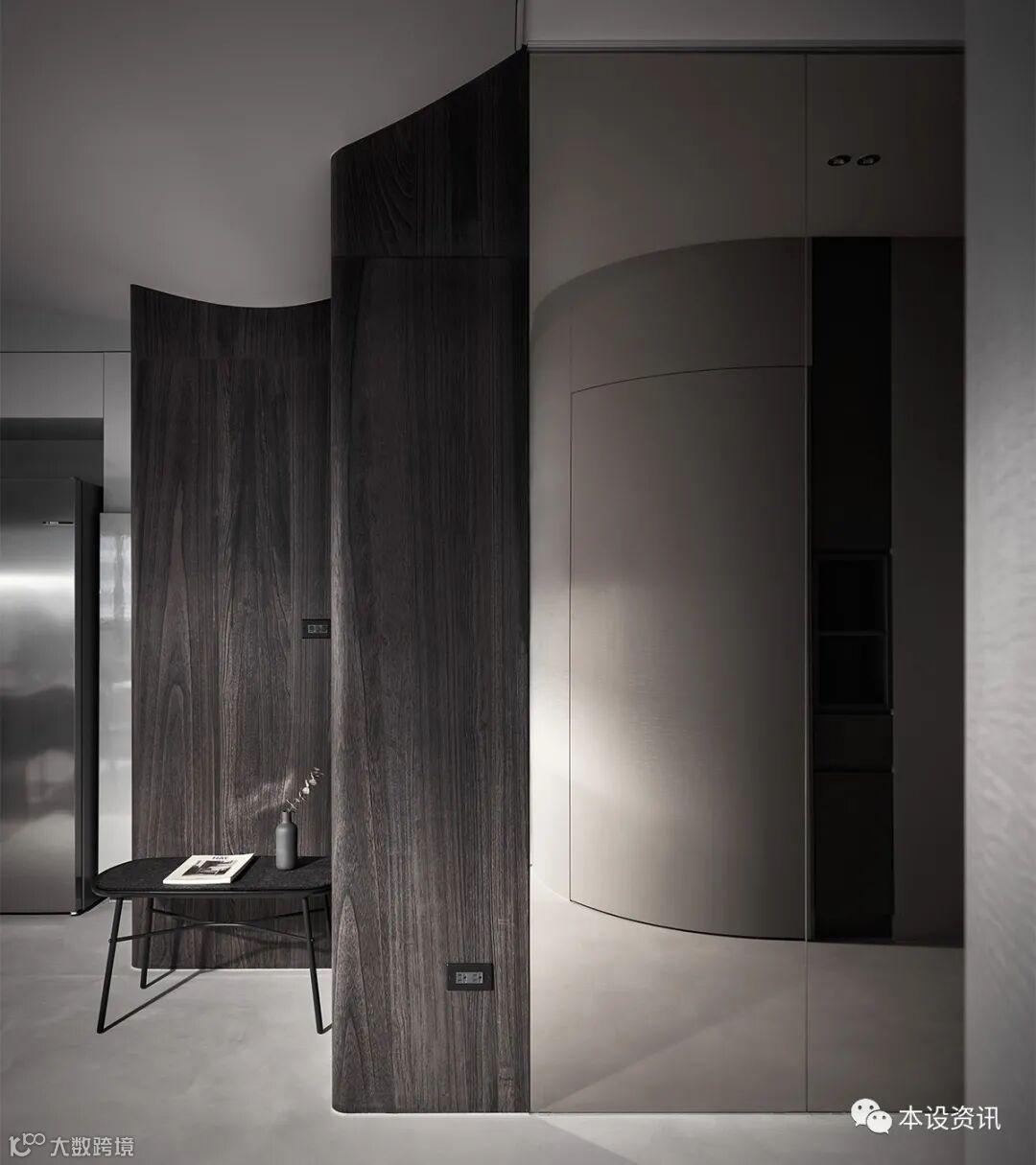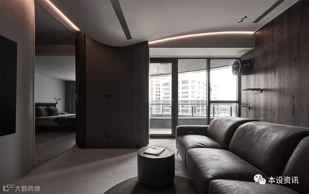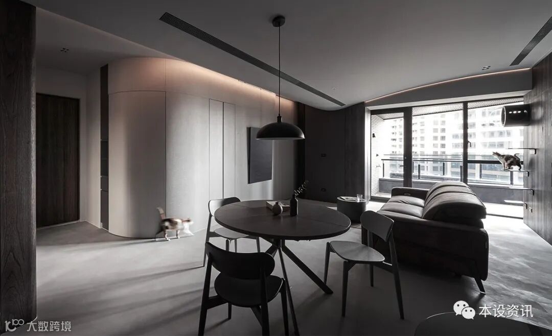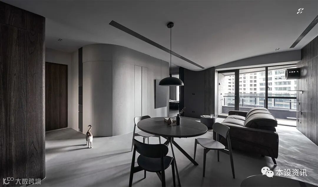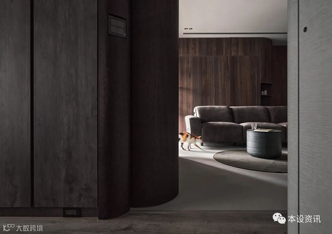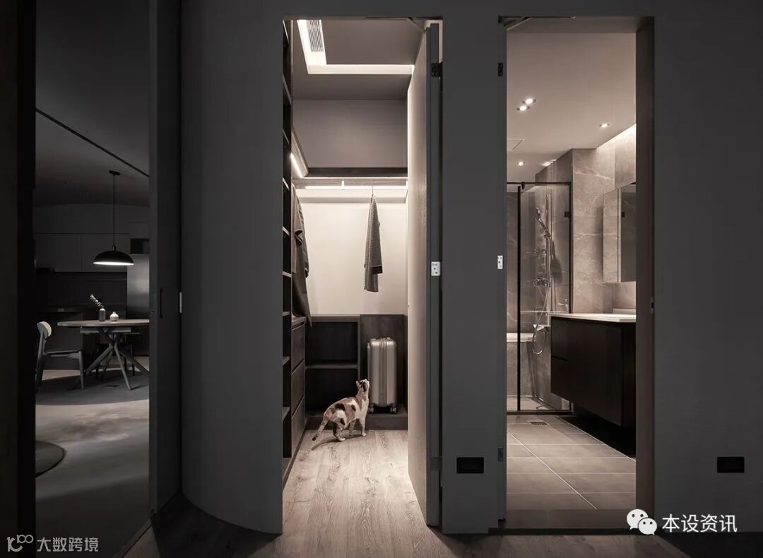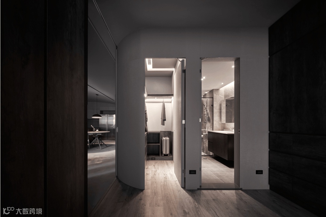 看似极简纯粹的画面,实则深藏著一间独立储藏室,凭藉弧线消弭量感,使收纳机能隐没无形,当返家时,即能将生活备品、行李箱或未来婴儿车随手归放,使尘灰止步、不沾染室内分毫。