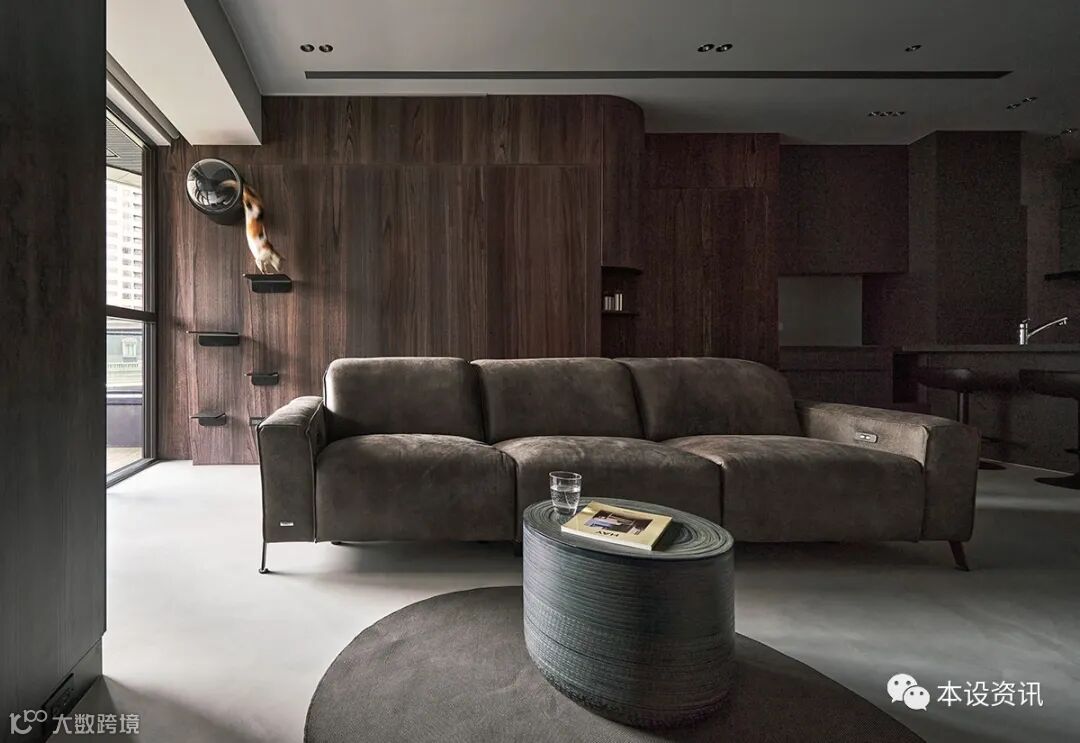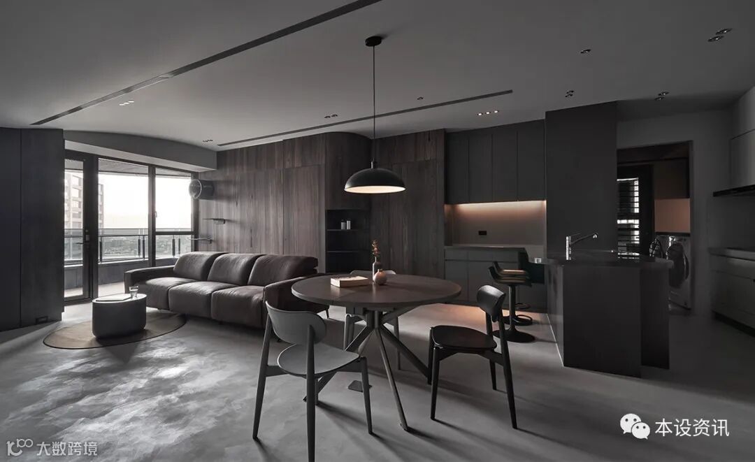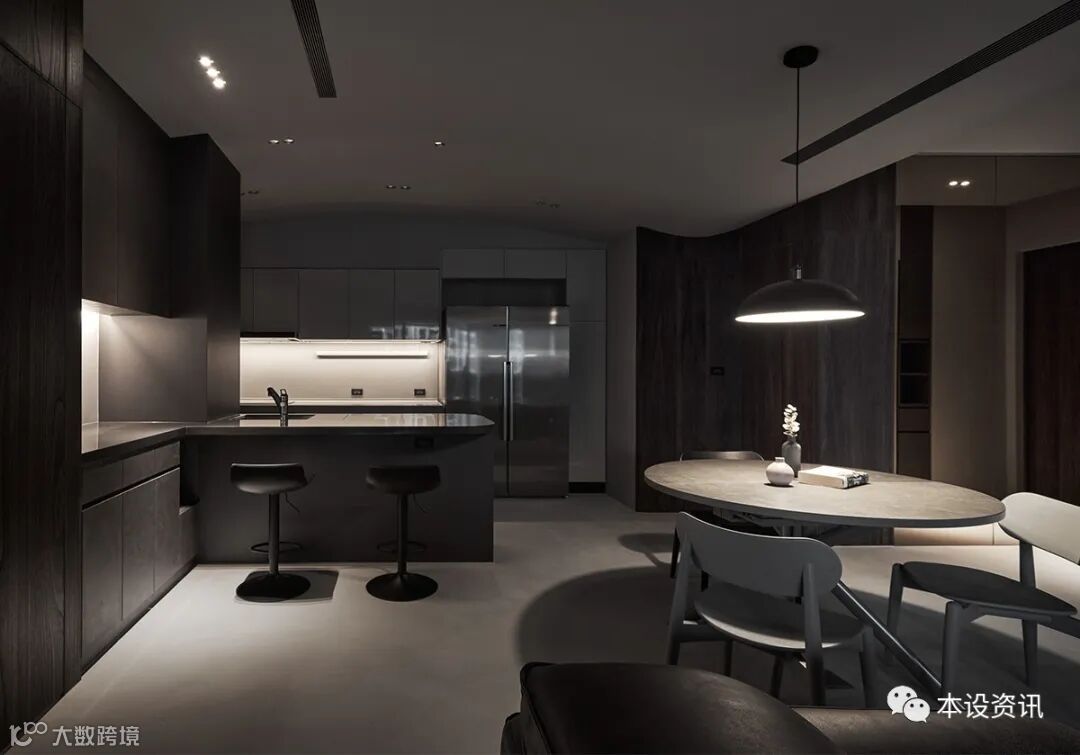 Deep brown wood texture is dense and spreading, and a table of iron ash is built into the dining side cabinet step by step, so that pet supplies can be properly placed, but also can gently connect with the kitchen utensils attached by the builder, become the implicit definition of open space, synchronous extension of the table into an L-shaped island, carefully determine the sink location, so that both sides can smooth water.