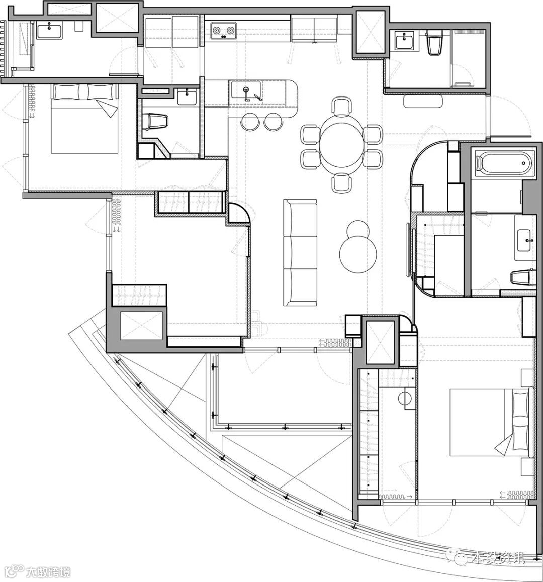 一弯波弧轻柔划开,依附著格局轮廓蔓延舒展,以婉转曲度抚平锐角、柔软空间身段,隐性牵起公领域的相依关係,亦细腻吻合扇形窗的开敞角度,恰如一方浑然天成的幽然境地。