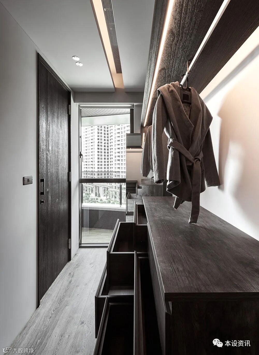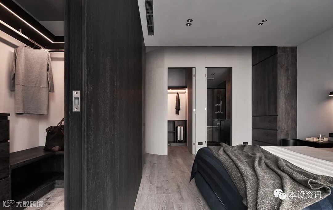 A soft arc opens the door, releasing the width that had been slightly hindering, and shuttles forward. With the quiet atmosphere of deep wood color, the thoughts are slowly precipitated, and the function of the bedroom is carefully adjusted synchronously. With the window frame as the boundary and the sliding door as the line, the clothes room belongs to the hostess's dream is framed.
