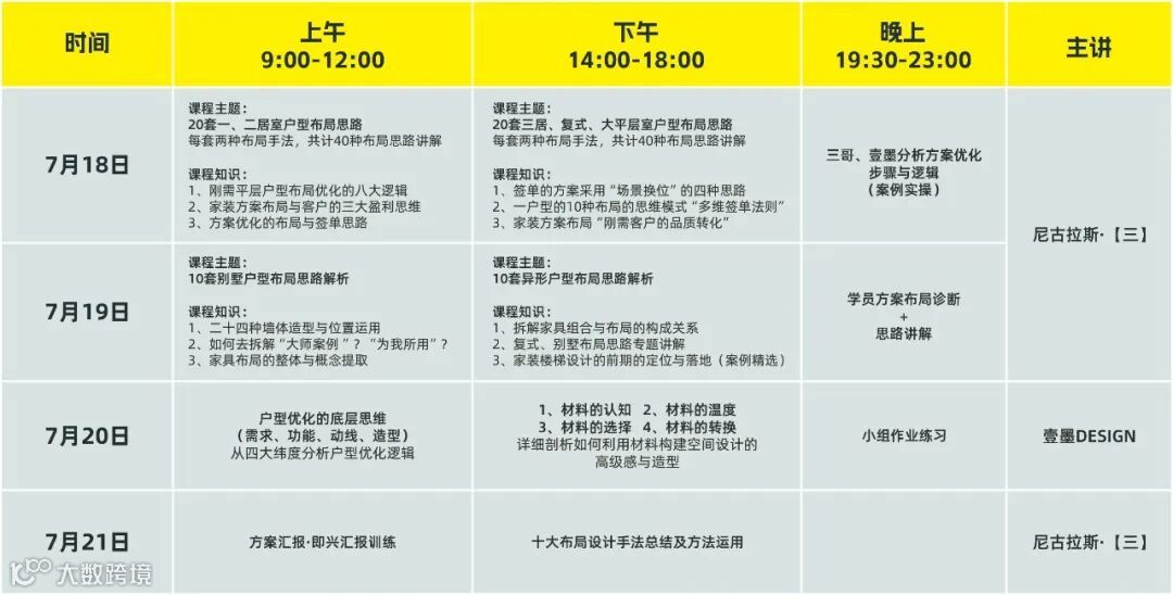 课程教学内容对户型做出直观总结,包含家装布局方法、户型分析、设计要求分析、户型的分区关系、墙体改造、家具组合、动线优化、空间立面推演;方案汇报及签单的整体逻辑;针对家装大平层和独栋别墅布局方法进行强化练习,丰富室内设计师项目的多样性。