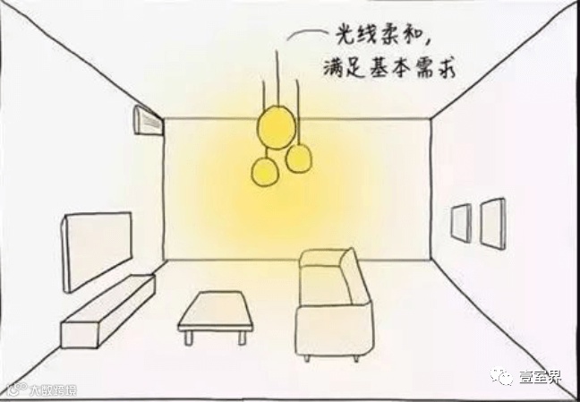 1、一般照明:它也常被称为“基础照明”、“环境照明”,它的作用主要就是提亮整个空间,使得客厅在夜晚和光线不好的时候,能有个基本的活动亮度。通常以吊灯、吸顶灯这类主灯来完成。