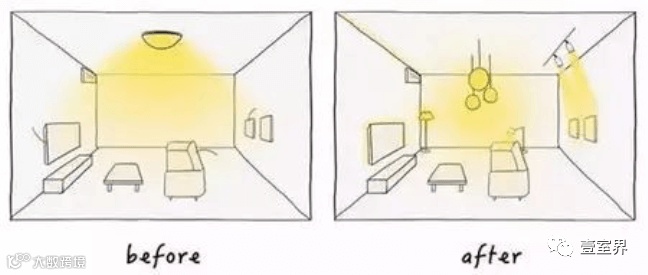 只是,这两者有个通病,就是存在明显的照明界限,也就是存在照明“死角”和较多的阴影,且可调节性不大。因此,建议大家不要单纯的采用半直接或半间接照明,而是采用点状光源,均匀分布于天花板。这样就可以根据亮度需要,单独开/关某一区域、或某几盏灯了。或者采用隐藏式漫射照明。