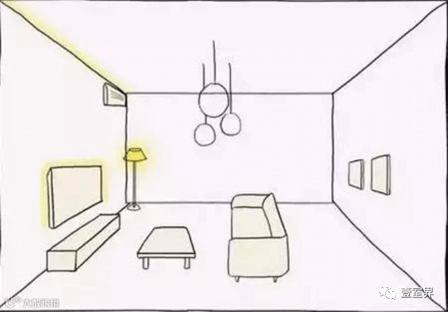 在电视机的一角配置一盏落地灯。并且,这样做还可以起到很好的装饰效果,同时还能在一定程度上缓解视觉疲劳。