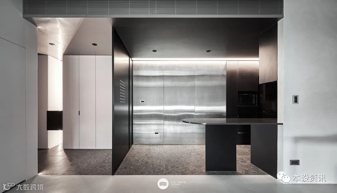 本案採用「不鏽鋼及鐵件的冷冽剛硬、特殊塗料的手作溫度、弧形曲線的流轉柔化、PANDOMO 地板的灰度串接」,四者悠遊於空間立面,重與輕之鮮明本質,順勢形成玄關廚房與客餐廳兩大場域的層次序曲。