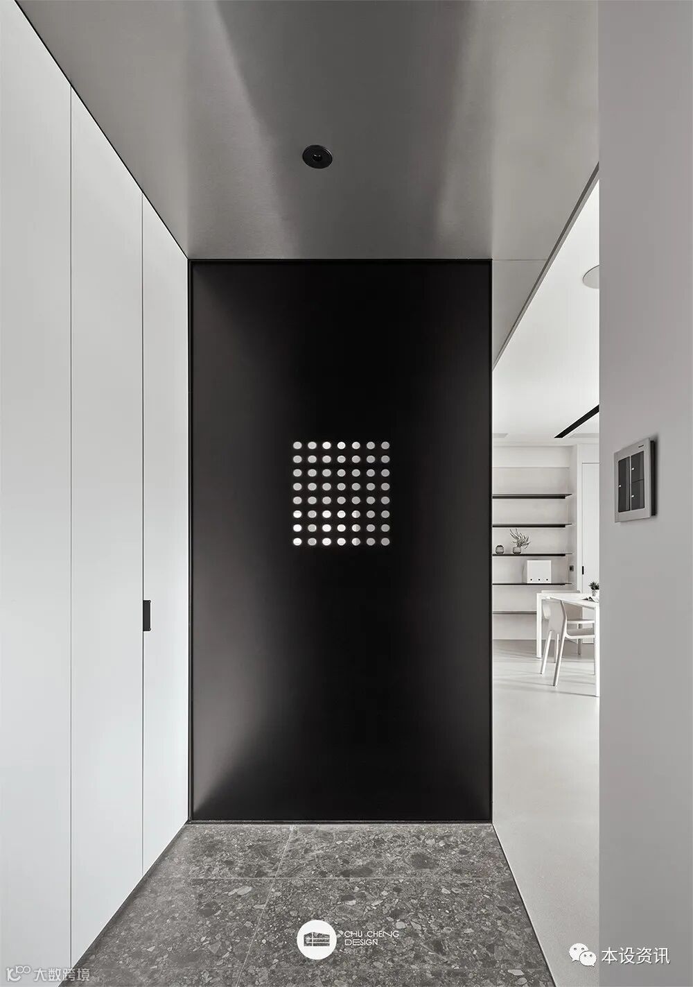 告別戶外喧嘩,返家第一眼,白灰黑建構之落塵區,素雅明淨沉穩心緒。與廚房以一道沖孔板造型鐵件區隔場域,其間光影穿透孔洞橫生樂趣。