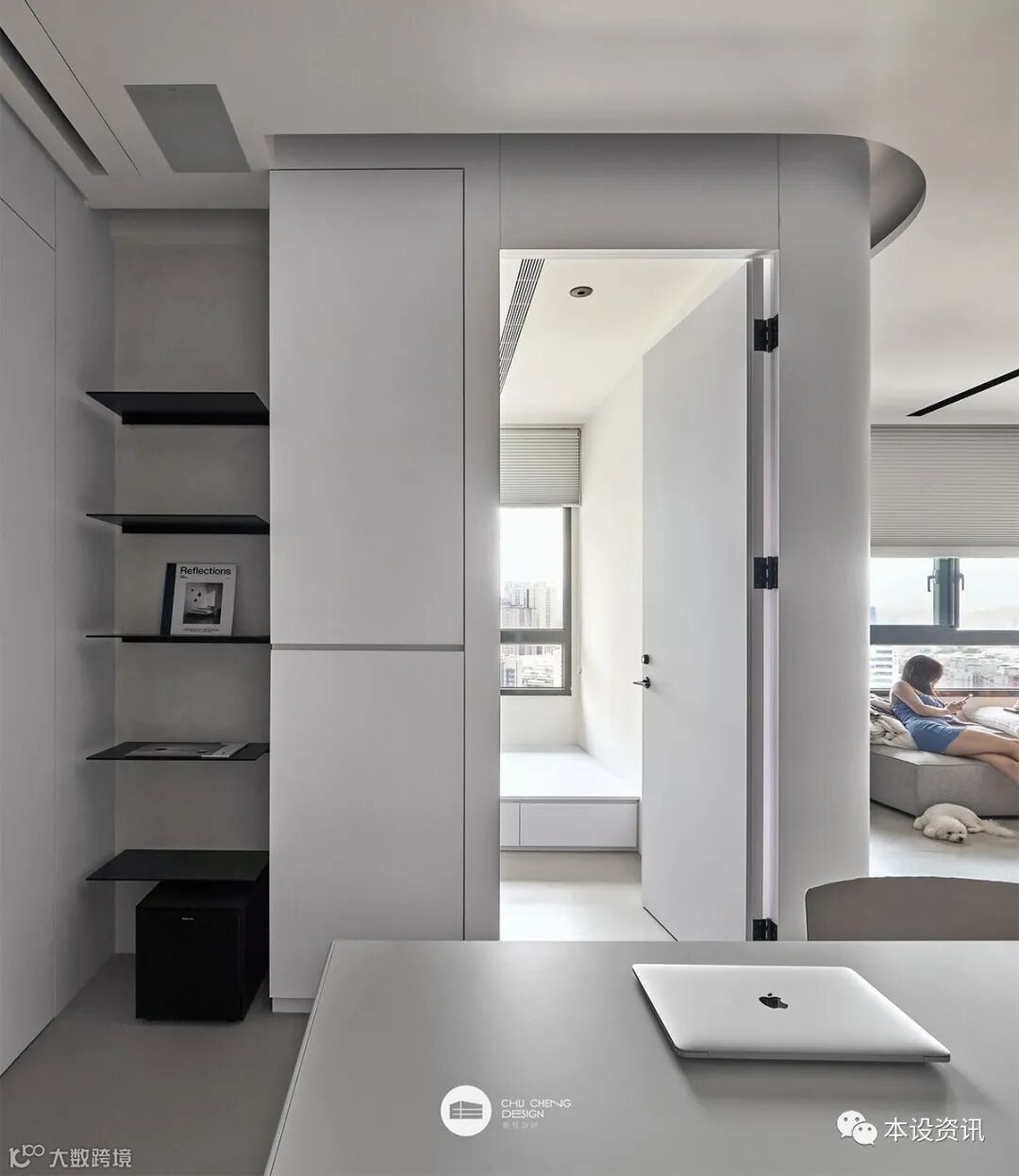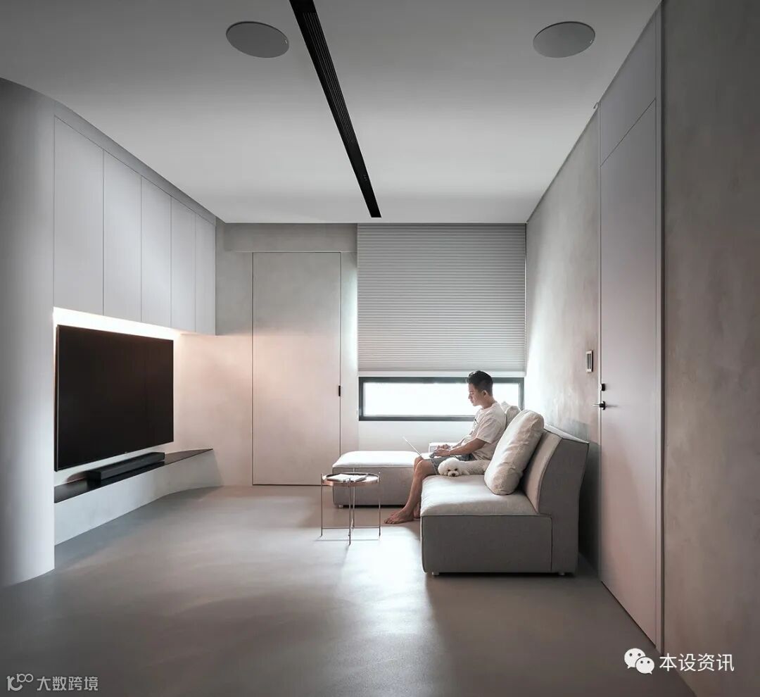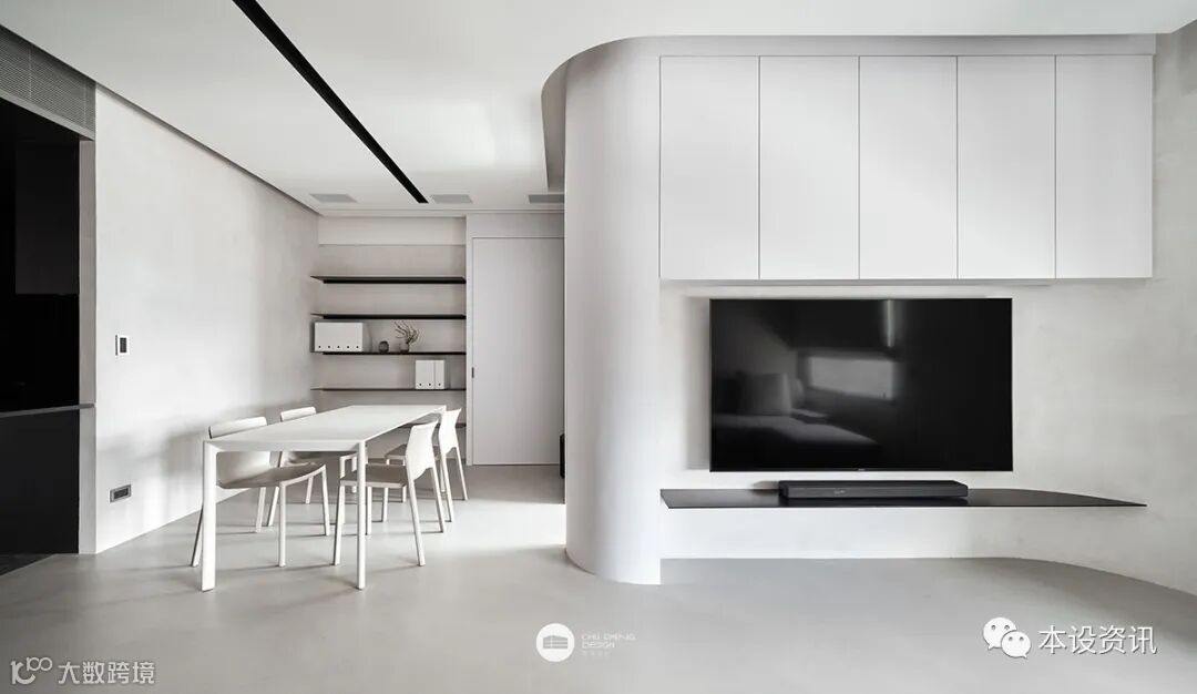 對應地坪及牆面的泥灰,電視收納櫃體以白色板材搭襯半圓弧造型映以柔情,電視下方崁搭薄片黑鐵層架置放影音主機,以極簡輕量騰出呼吸餘裕。環繞音響設備隱於天花板,T字黑線條為冷氣出風口及隱藏光帶,潔白中立現線性張力。