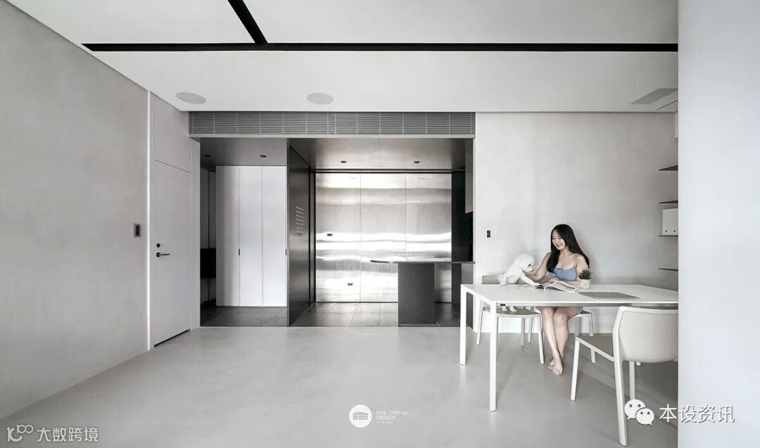 別於玄關及廚房的灰黑剛性,客餐廳以淺灰及雅白盈滿輕柔景致,經由質材及色系形成一分為二的直線式場域界定。