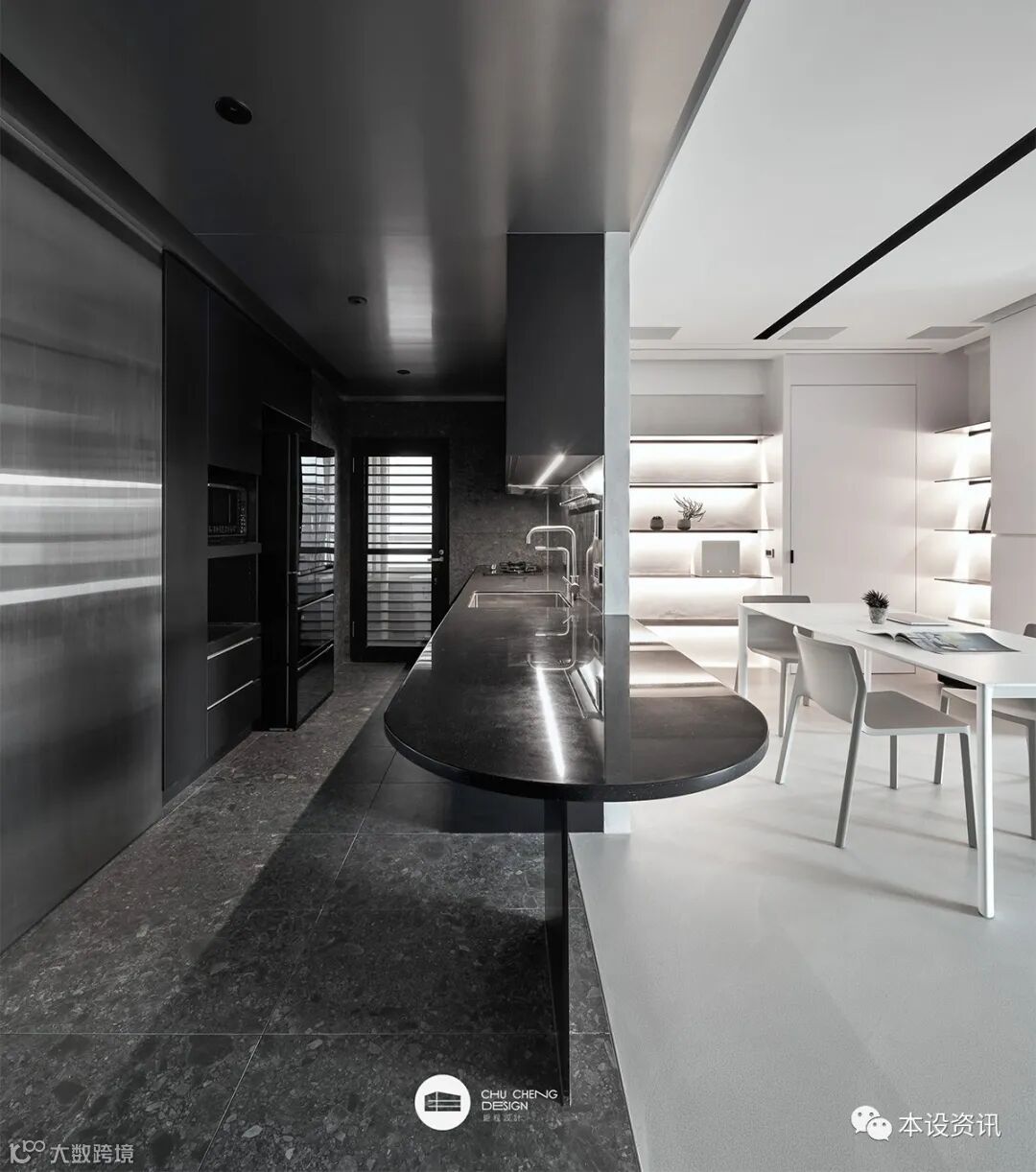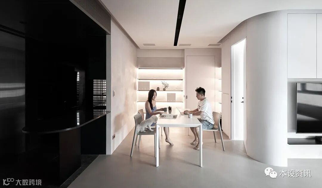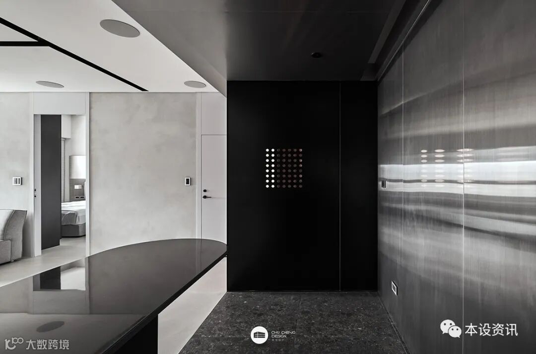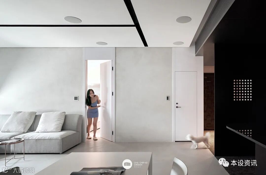 男主人獨鍾黑白灰的經典純粹、女主人偏愛特殊質材的藝術韻味,設計團隊巧妙揉合「去繁瑣」凝鍊材質天然肌理、「無色彩」調配低調內斂色系,剛性選材搭配柔弧設計,遞嬗空間象限,以留白詩意與這座宅邸來場永恆之戀!