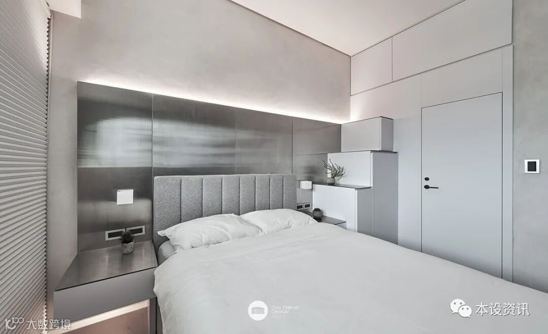 床頭壁面使用特殊塗料鑲崁大片不鏽鋼,覆上灰色軟墊,軟硬連動串接。兩側床頭櫃,木作搭配鋼片檯面,異材質混搭勾勒細節。右側床頭旁之過渡區塊靈活創意巧思,以梯式櫃體造型拾階而上,可自由取放衛浴上方之收納空間。