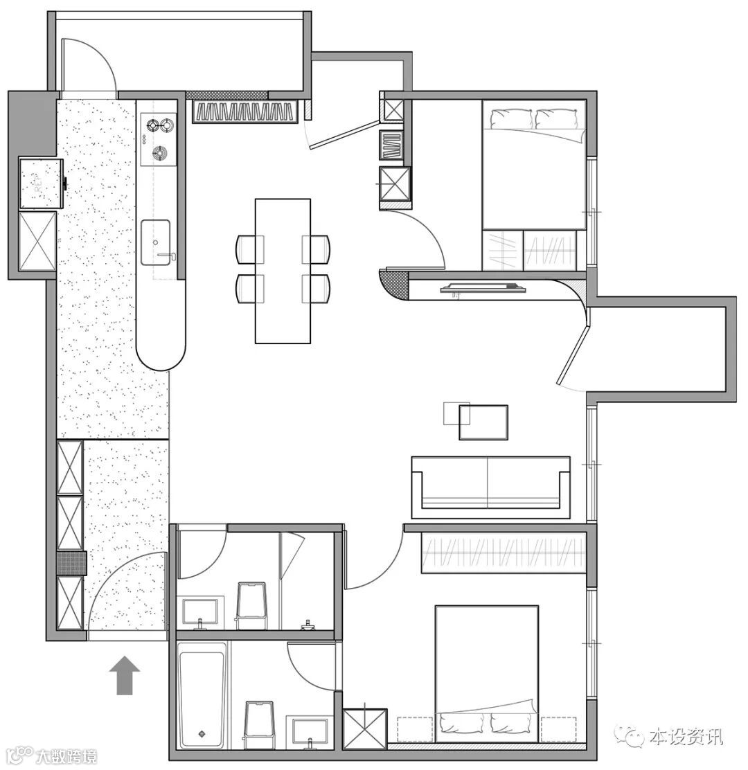 屋主暫無增添家庭成員之計畫,希望客餐廳更為通透寬敞,無論視訊會議或親友聚會,皆能進退有度。我們將 3 房改為 2 房,放大餐廳空間,便於提昇餐桌量體,並增加投影設備。原始封閉廚房調整為開放式,延展廚房檯面形成輕食吧台,豐厚機能需求。