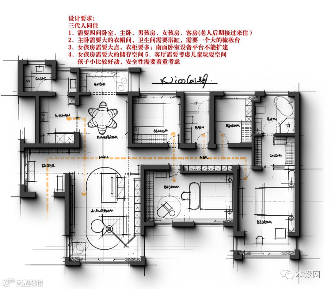 2、入户需要一个相对独立的玄关空间;主卧需要衣帽间;