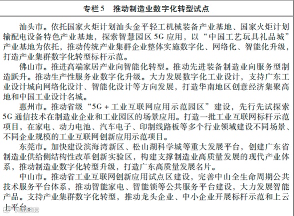 2.推动制造业数字化转型。聚焦战略性支柱产业和新兴产业集群,深入推动数字化、智能化、网络化转型。支持规模以上工业企业开展生产线装备智能化改造,重点实施以传统制造装备联网、关键工序数控化等为重点的技术改造,加快先进智能装备和系统普及应用,建设智能生产线、智能车间和智能工厂。推动5万家以上工业企业运用工业互联网实施软硬一体的数字化改造。推动龙头制造企业依托工业互联网平台,与上下游产业链企业实现深度互联,打造全产业链信息数据链,提升信息、物料、资金、产品等配置流通效率。进一步发展壮大省工业互联网产业生态供给资源池,培育超过500家具备较强实力的工业互联网服务商。推动企业“上云用数赋智”,开展数字化转型促进行动,争取国家支持,建设一批国家数字化转型促进中心,鼓励发展数字化转型共性支撑平台和行业“数据大脑”。培育发展一批跨行业跨领域和特定行业特定领域工业互联网平台,搭建平台企业与中小微企业对接机制。推动特色产业集群数字化转型,鼓励有条件的地区和企事业单位创建行业型、区域型、企业型数字化转型服务平台,提升产业集群工业企业整体数字化转型能力。实施“定制之都”示范工程,围绕定制家居、汽车、时尚服饰、智能终端、专业服务等重点领域,打造集总部经济、展示体验为一体的产业集聚园区。(省工业和信息化厅牵头,省发展改革委、有关市政府按职责分工负责)