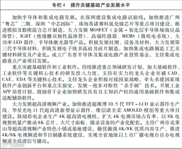 4.提升关键基础产业发展水平。重点突破高端通用芯片设计,大力发展第三代半导体芯片,前瞻布局毫米波芯片、太赫兹芯片等;优先发展特色工艺制程芯片制造,支持先进制程芯片制造,积极推进数模混合芯片制造,探索发展FDSOI、异构集成等新技术路径。支持大型工业软件企业突破CAD、CAE、EDA等关键核心技术,开展工业APP培育计划,鼓励骨干企业加快研发具有自主知识产权的通用基础软件和集成适配辅助软件,推动国家通用软硬件适配测试中心建设。以片式化、微型化、集成化、高性能为目标,重点突破关键材料、核心电子元器件研发瓶颈,向中高端电子元器件研发与产业化发展。推进超高清视频产业发展试验区建设,布局建设一批省超高清视频产业园区,建设广佛惠世界级超高清视频和智能家电产业集群,争取开通新的4K电视频道,建设100个以上超高清视频应用示范项目。(省发展改革委、省工业和信息化厅牵头,省科技厅、省广电局、有关市政府按职责分工负责)