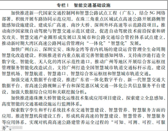 2.打造大湾区新型智慧城市群。支持广州、深圳等地市建设“城市大脑”,构建“万物互联、无时不有、无处不在”的城市大脑神经感知网络。在有条件的城市和区域推进市政公用设施、应急广播等基础设施与5G网络、物联网、传感技术融合建设,推进智能生活垃圾转运站、智能逆向物流回收系统、医疗废物智慧监管系统、“互联网+废旧家电”回收体系、智慧化应急广播体系等建设。积极推进智慧灯杆建设,加快推进现有灯杆“一杆多用”改造。提升城市交通运行智能化管控水平,加快互联网数据和城市路口信号控制系统双向互通,实行交通控制随流量柔性调节。加快完善停车诱导系统和停车智能收费系统建设,推进停车泊位共享平台建设。坚持数字城市与现实城市同步规划、同步建设,支持广州和深圳探索建设具有深度学习能力、全球领先的数字孪生城市。(省发展改革委、省住房城乡建设厅牵头,省工业和信息化厅、省公安厅、省生态环境厅、省交通运输厅、省广电局、省政务服务数据管理局、省通信管理局、有关市政府按职责分工负责)