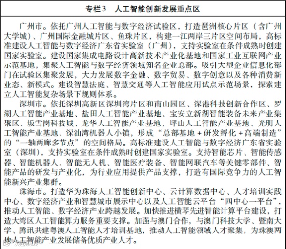 3.加快建设人工智能、区块链等新一代通用信息技术生态体系。支持广州、深圳推进国家新一代人工智能创新发展试验区和国家人工智能创新应用先导区建设,打造人工智能技术创新策源地、集聚发展新高地、开放合作重点区和制度改革试验田。推进人工智能开放创新平台建设,推动重点软硬件基础平台开源共享,支持深圳构建新一代国家人工智能基础开源平台,形成多元创新主体共同参与、协同创新平台有力支撑、场景应用深入融合的人工智能产业生态圈。突出发展智能无人机、智能无人船、智能机器人等智能产业,加快建设国家无人机系统质量监督检验中心,支持建设珠海无人船海测基地、湛江水下机器人测试基地等。加速培育人工智能辅助诊断、人工智能辅助医疗等智能医疗产业发展。支持建设一批区块链基础架构、安全保护、跨链互操作、链上链下数据协同、监管等区块链基础平台型重大项目,鼓励区块链领军企业建设自主区块链底层技术平台和开源平台。支持广州建设国家区块链发展先行示范区,支持打造广州、深圳、珠海、佛山、东莞等区块链产业集聚区。(省科技厅、省工业和信息化厅牵头,省发展改革委、有关市政府按职责分工负责)