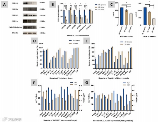 CYP450是外源物质代谢的重要肝脏酶,它能使电子通过非共价键与血红素中的铁离子结合,氧化并增强外源生物的水溶性,使其更容易被排出体外。本研究采用Western blot法检测细胞色素CYP1A2、2B6、2C9、2C19、3A4、P450还原酶的表达,结果如图5A所示。将各自的值与动态3D得到的值进行比较,计算相对表达率,如图5B所示。其中,1A2和2C9在动态3D明显高于静态3D和2D,3A4和P450还原酶表达稍弱,但趋势与1A2和2C9相似。2B6在静态3D培养中的表达量略高于动态3D和2D,但与3D动态条件下无显著差异。本研究未检测到2C19。如图5C所示,动态3D培养72h后ALB和尿素的表达水平高于静态3D和2D,说明动态3D培养的肝细胞具有更好的肝功能。综上所述,相比传统细胞培养方式,3D-DMLoC培养干细胞球具有更好、更全面的肝功能,可为肝脏研究提供更可靠的体外肝组织模型。