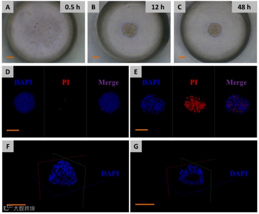 如图3A-C所示,0.5h后肝细胞基本聚集在微孔中心,12h后基本形成球状,48h后形成圆球体。培养7天后冲洗出球体,用DAPI染色细胞核,观察球体大小和球体内腔。对图3D和E中x、y、z轴球体的中心重建显示,动态培养的球体的空洞明显小于静态条件下的空洞,说明3D-DMLoc可以为球体中心提供足够的营养和氧气,使细胞生长成更圆、更致密的球体。而在静态培养条件下,细胞倾向于向外生长,以获得足够的营养和氧气,从而导致细胞尺寸比动态情况下大。进一步结合PI染色标记晚期凋亡细胞和坏死细胞,动态培养时球体内只有少量细胞被PI染色,坏死比例极低,而静态球体内大量细胞被染色,坏死比例较高,如图3F和G所示。综上所述,3D-DMLoc在共培养肝细胞方面具有生物学适用性。