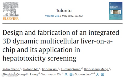 [1] Zheng YB, Ma LD, Wu JL, et al. Design and fabrication of an integrated 3D dynamic multicellular liver-on-a-chip and its application in hepatotoxicity screening[J]. Talanta, 2022, Volume: 241. DOI: 10.1016/j.talanta.2022.123262