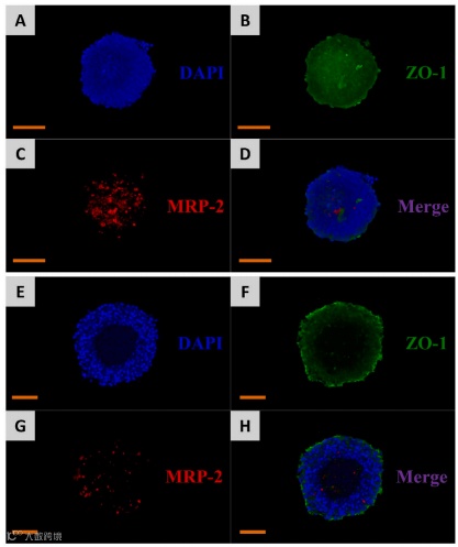 肝脏极化是肝脏发挥代谢和转运功能的重要基础,也是评价体外肝脏模型适用性的重要指标。多药耐药蛋白2(MRP2)是一种功能性蛋白,通常位于相邻细胞之间的小管间隙中,负责偶联胆汁盐和胆红素的排泄。紧密连接蛋白-1(Occludens Protein-1,ZO-1),也称为小带蛋白,是位于细胞-细胞接触部位的紧密连接和粘附连接的膜相关成分。这些蛋白染色可以识别小管间隙的位置,观察细胞-细胞连接的紧密程度,评价胆管样结构的形成程度。如图4所示,MRP2和ZO-1在3D-DMLoC中的荧光分布比在静态3D中更宽、更轻,表明细胞生长良好,重建肝脏极化更好。MRP2在球体内部高度表达,在不同区域聚集形成一定的连接。而在静态球体中,虽然ZO-1的表达也相对较高,但MRP2的表达较为稀疏和分散分布,明显低于3D-DMLoC。此外,细胞核染色图显示静态球体中有较大的空腔,动态球体中没有明显的空腔,也证明动态培养的球体可以获得更多的营养来维持细胞的生长。