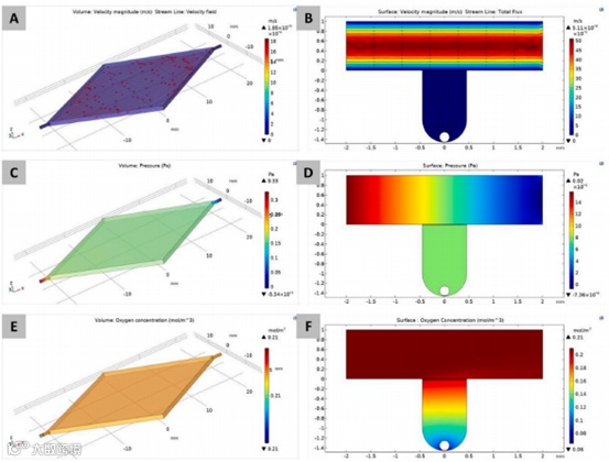 采用COMSOL Multiphysics软件建立3D-DMLoC中功能单元(每个微孔)的有限元模型,首先设置灌注速度范围为1 ~ 100μL/min,然后分别模拟和分析肝细胞球体周围的流体流线、压力和氧浓度。图2A所示为上流道的速度大小和流线,证明注入上流道的流体能够均匀地向阵列上方流动。图2B展示了流速大小和下层液体通道流线,表明液体可以通过膜流向肝细胞球体的外周,这种流动有助于输送新鲜营养物质和清除球体周围的代谢废物。从图2C和2D的结果可以看出,流体通道内或球体周围的压力是均匀的,适合于细胞的生长,保证细胞不会因为压力差而形成不规则形状和发育混乱。由于PDMS具有良好的透气性,且芯片尺寸合适,1μL/min的灌注已足以为球体周围提供足够的氧气。氧浓度随流速从1~100μL/min的升高而逐渐升高,但当流速超过20μL/min时,上升速率变得非常低。同时,随着流速的升高,肝细胞球体周围的压力也在增加,可能发生潜在的细胞损伤,导致细胞应激反应发生不可预测的变化,而这种压力与生理环境有很大的不同。因此,虽然流速设置得越快,可以为肝细胞提供越多的营养和氧气,但这意味着细胞长时间培养将需要大量培养基,也会导致细胞分泌的信号被过度稀释,因此在后续实验中最终设置了20μL/min的流速,上下通道的氧浓度如图2E和F所示。