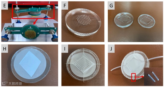 本研究设计了一种在动态三维条件下内皮细胞与肝细胞共培养的简便、快速、可重复的方法,使肝细胞能够聚集形成球状肝组织而不是单层生长。根据设计,制作了如图1E所示的微孔阵列生成模具,然后对微孔阵列进行如图1F所示的成型,该模具可以制作出均匀性高的阵列。用10倍物镜观察单孔的尺寸,孔的实际直径接近900 μm,证明该模具较好地满足了设计要求。阵列凹微孔的设计可以保证足够的球体大小和细胞总量,用于后续的免疫荧光成像、蛋白检测或其他此类实验。