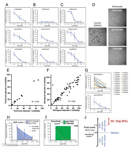 该研究还提出了一种评分系统(两步评分法)来对每个PDO药物敏感性进行排序。首先,通过确定每种药物的平均和特异性反应曲线下面积(AUC),计算了一个比率,即AUC得分(AUC score=AUC average/AUC PDO),以评估特定PDO与PDO集合的响应程度;第二步进行敏感性评分,表示PDO对三种药物浓度的直接反应。最后将AUC得分和敏感性得分相加,得到最终的药物敏感性分数。根据计算结果,本研究将得分>1.9作为药物对特定类器官敏感的阈值。